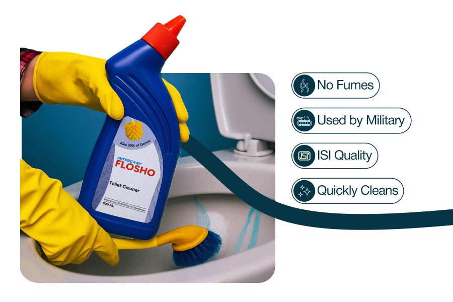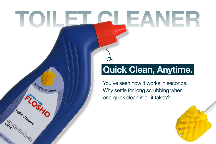 Intercorp’s Flosho is a quality cleaner for a disinfected, clean and shining toilet. It removes lime scales (chalky deposits) due to dissolved salts in hard water. Kills 99.9% germs including bacteria, fungus and virus. Flosho leaves behind a sparkling clean, hygienic, fresh and germ-free toilet without any odor. Order now!