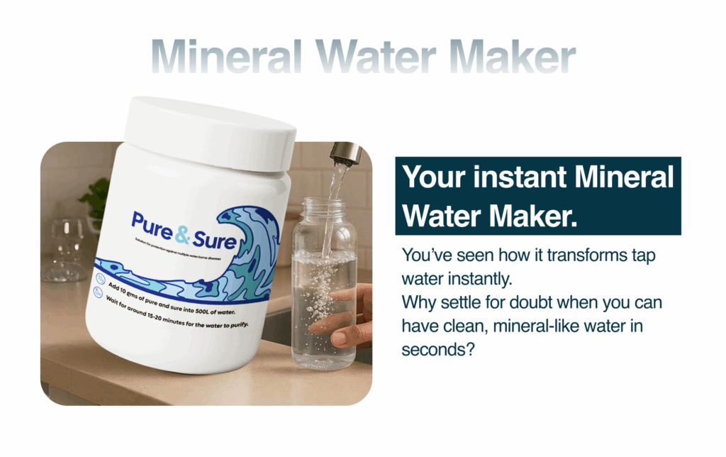 From scooping to sipping, Pure & Sure makes disinfection effortless whether you’re at home or oJust scoop, mix, and wait. Pure & Sure turns regular water into AIIMS-tested mineral water without any machines, filters, or fuss.